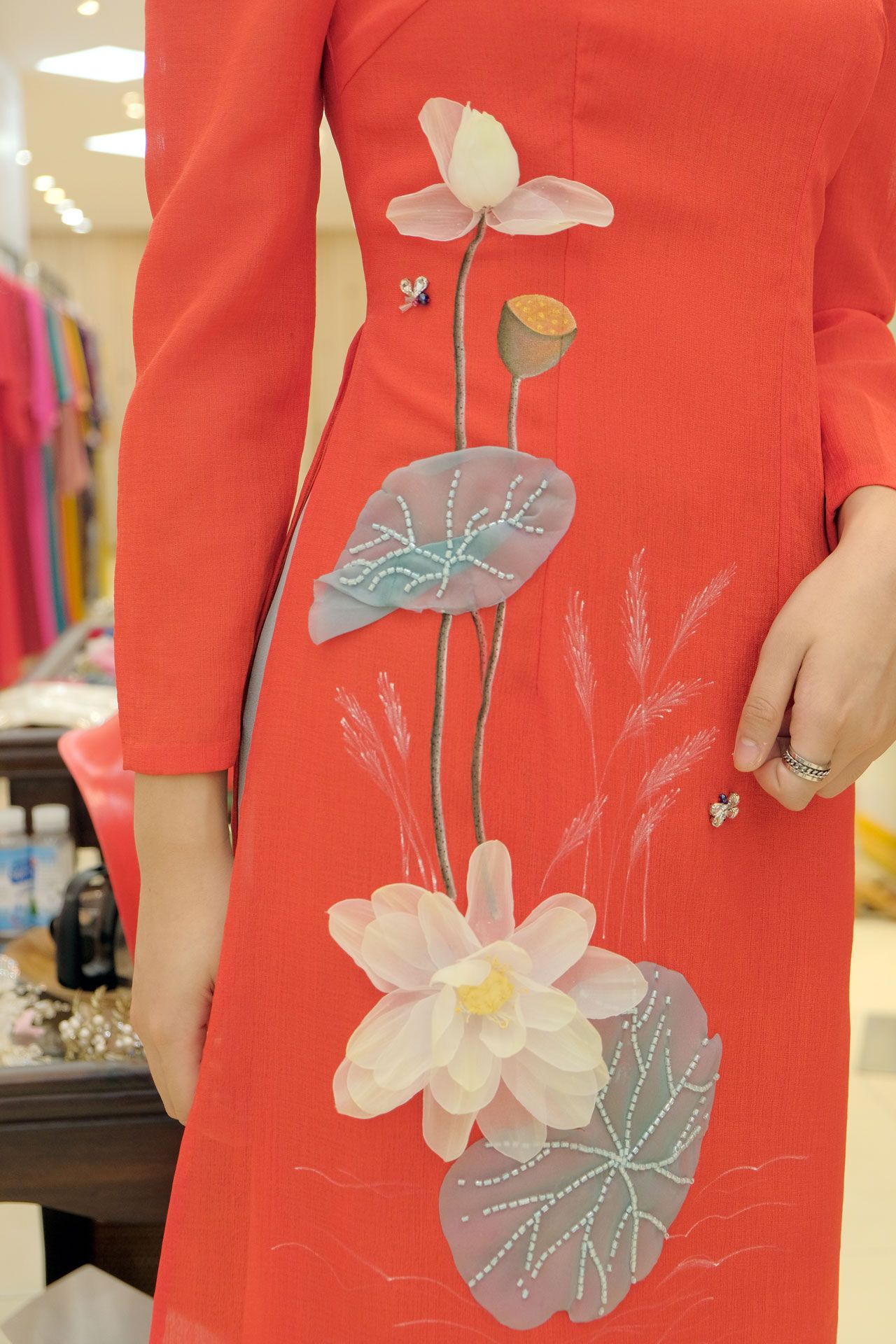 Áo dài cách tân đang dần trở nên quen thuộc với phái nữ. Với thiết kế phá cách độc đáo nhưng vẫn giữ được sự tinh tế, tao nhã, kín đáo, áo dài cách tân có thể được diện trong nhiều dịp như đi làm, đi chơi, đi chụp ảnh,…Với chất vải thoáng mát, cùng đường may tỉ mỉ chắc chắn sẽ giúp các nàng có cảm giác thoải mái nhất khi diện mẫu áo dài cách tân này. Đặc biệt, với bông sen đính pha lê trắng kết hợp với thêu tay tỉ mỉ khiến bộ áo dài cách tân trở nên sang trọng và độc đáo hơn bao giờ hết.